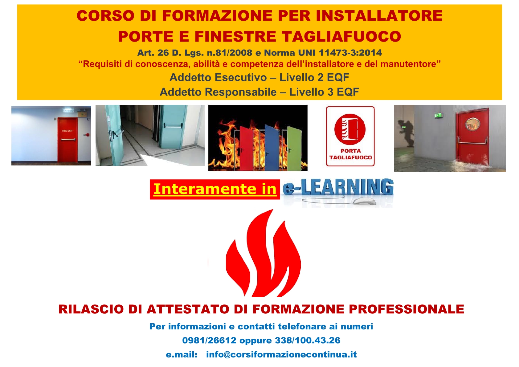 Il corso è interamente on-line e potrà essere seguito in qualunque momento della giornata, tutti i giorni, compresi i festivi. Le credenziali per l’accesso alla piattaforma fad saranno trasmesse al corsista entro 24-48 orInstallatore di porte e finestre tagliafuocoe dal momento della sua iscrizione.